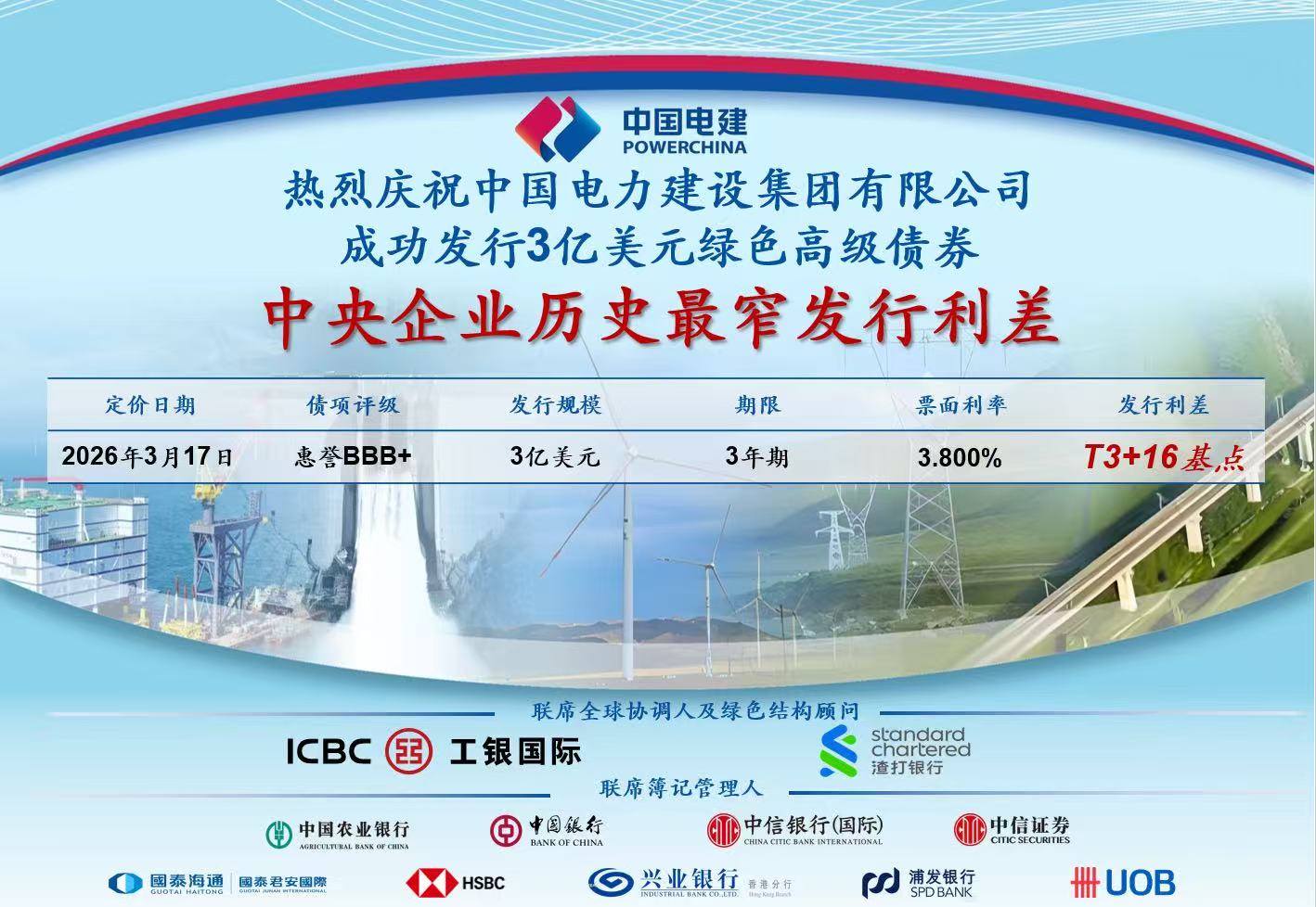 3月17日,公司在香港聯(lián)交所成功發(fā)行3年期3億美元高級(jí)綠色債券,發(fā)行票息3.8%,發(fā)行利差T+16bps,創(chuàng)下中央企業(yè)境外債券發(fā)行史上最窄利差紀(jì)錄,成為2026年首單央企境外綠色債券,彰顯了公司在國(guó)際資本市場(chǎng)的強(qiáng)勁競(jìng)爭(zhēng)力與良好口碑。 本次發(fā)行由公司黨委常委、總會(huì)計(jì)師楊良親自帶隊(duì)統(tǒng)籌推進(jìn),全程精準(zhǔn)部署、高效聯(lián)動(dòng)。期間,團(tuán)隊(duì)成功舉辦高質(zhì)量投資者溝通會(huì)、與工銀國(guó)際、建銀亞洲等機(jī)構(gòu)深入會(huì)談,并開展全球交易路演,面向國(guó)際投資者深度宣講集團(tuán)戰(zhàn)略、經(jīng)營(yíng)成效、信用實(shí)力與綠色發(fā)展藍(lán)圖,路演推介成效顯著。 本次債券發(fā)行獲得國(guó)際資本市場(chǎng)踴躍認(rèn)購(gòu),賬簿峰值認(rèn)購(gòu)倍數(shù)接近8倍,投資者結(jié)構(gòu)優(yōu)質(zhì)多元,覆蓋港澳、新加坡及歐洲等核心市場(chǎng),充分體現(xiàn)了全球資本對(duì)中國(guó)電建信用水平與發(fā)展前景的堅(jiān)定信心。此次境外債券的成功發(fā)行將進(jìn)一步提升公司國(guó)際資本市場(chǎng)形象,為公司海外投融資業(yè)務(wù)高質(zhì)量發(fā)展和“十五五”規(guī)劃良好開局提供有力支撐。 路演期間,楊良還專程前往電建海投香港公司調(diào)研,并親切慰問一線員工。他圍繞電建海投香港公司下一步高質(zhì)量發(fā)展提出六點(diǎn)要求:一是持續(xù)強(qiáng)化投資質(zhì)量管控,筑牢發(fā)展根基;二是依托香港區(qū)域優(yōu)勢(shì)統(tǒng)籌全球資金資源,更好服務(wù)集團(tuán)海外投資及各子企業(yè)發(fā)展;三是加強(qiáng)與集團(tuán)境外財(cái)資中心業(yè)務(wù)聯(lián)動(dòng),實(shí)現(xiàn)資源共享、協(xié)同發(fā)展;四是聚焦國(guó)家戰(zhàn)略,深化人民幣國(guó)際化相關(guān)研究與實(shí)踐;五是緊跟金融科技發(fā)展趨勢(shì),推進(jìn)法定數(shù)字貨幣、區(qū)塊鏈等技術(shù)應(yīng)用,提升國(guó)際結(jié)算效率、降低運(yùn)營(yíng)成本、盤活存量資產(chǎn);六是加強(qiáng)國(guó)際化人才隊(duì)伍建設(shè),為青年人才搭建廣闊平臺(tái)。 公司財(cái)務(wù)金融部、海外事業(yè)部、電建海投公司相關(guān)負(fù)責(zé)人參與本次債券發(fā)行及調(diào)研。 |