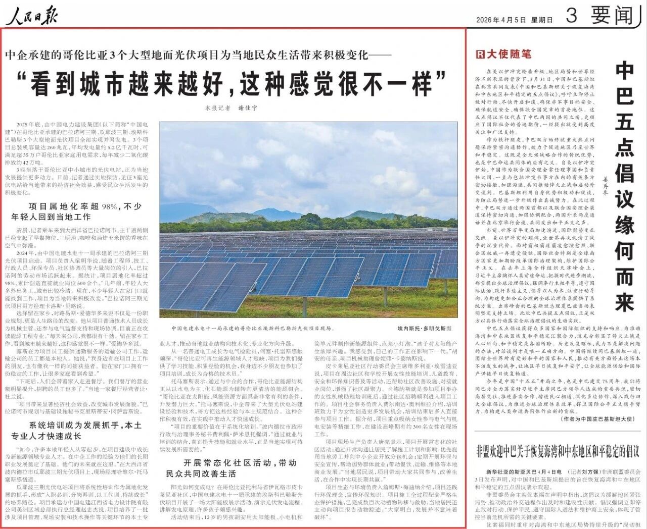 2025年底,由中國(guó)電力建設(shè)集團(tuán)(以下簡(jiǎn)稱“中國(guó)電建”)在哥倫比亞承建的巴拉諾阿三期、瓜耶波三期、埃斯科巴勒斯3個(gè)大型地面光伏項(xiàng)目全部實(shí)現(xiàn)并網(wǎng)發(fā)電。3個(gè)項(xiàng)目總裝機(jī)容量達(dá)260兆瓦,年均發(fā)電量約5.2億千瓦時(shí),可滿足超35萬(wàn)戶哥倫比亞家庭用電需求,每年減少二氧化碳排放約42萬(wàn)噸。 3座坐落于哥倫比亞中小城市的光伏電站,正為當(dāng)?shù)匕l(fā)展提供更多動(dòng)力。日前,記者通過(guò)實(shí)地探訪,見(jiàn)證3座光伏電站給當(dāng)?shù)貛?lái)的經(jīng)濟(jì)社會(huì)效益,感受民眾生活發(fā)生的積極變化。 項(xiàng)目屬地化率超98%,不少年輕人回到當(dāng)?shù)毓ぷ?/strong> 清晨,記者乘車來(lái)到大西洋省巴拉諾阿市,主干道兩側(cè)已經(jīng)支起了早餐攤位,三明治、咖啡和油炸玉米餅的香味在空氣中彌漫。 2024年,由中國(guó)電建水電十一局承建的巴拉諾阿三期光伏項(xiàng)目啟動(dòng)。項(xiàng)目負(fù)責(zé)人梁明華說(shuō),隨著工程師、技工、行政人員、環(huán)保專員、社區(qū)協(xié)調(diào)員等大量崗位的引入,巴拉諾阿的勞動(dòng)市場(chǎng)活躍起來(lái)。據(jù)統(tǒng)計(jì),項(xiàng)目屬地化率超過(guò)98%,累計(jì)創(chuàng)造直接就業(yè)崗位500余個(gè)。“幾年前,年輕人大多外出務(wù)工,城市比較冷清。現(xiàn)在,不少年輕人在家門(mén)口就能找到工作,項(xiàng)目為當(dāng)?shù)貛?lái)積極改變。”巴拉諾阿三期光伏項(xiàng)目哥方經(jīng)理卡洛斯·貝略說(shuō)。 選擇留在家鄉(xiāng),對(duì)路易斯·愛(ài)德華多來(lái)說(shuō)不僅是一份職業(yè)規(guī)劃,更是人生路徑的改變。他從項(xiàng)目普通技術(shù)人員成長(zhǎng)為機(jī)械主管,還參與電氣監(jiān)督支持和現(xiàn)場(chǎng)協(xié)調(diào),目前正在攻讀能源工程專業(yè)。“每天來(lái)公司,我都很有干勁。留在家鄉(xiāng)工作,看到城市越來(lái)越好,這種感覺(jué)很不一樣。”愛(ài)德華多說(shuō)。 露斯在為項(xiàng)目員工提供通勤服務(wù)的運(yùn)輸公司工作,運(yùn)輸公司的員工都是本地人。她說(shuō),“我身邊有在項(xiàng)目上工作的朋友,也有像我一樣的間接獲益者。能在家門(mén)口擁有一份穩(wěn)定的工作,讓很多家庭看到希望。” “下班后,人們會(huì)帶著家人走進(jìn)餐廳。我們餐廳的營(yíng)業(yè)額明顯提升,招聘的員工也多了。”當(dāng)?shù)匾患也蛷d經(jīng)營(yíng)者讓·杜蘭說(shuō)。 “項(xiàng)目帶來(lái)顯著經(jīng)濟(jì)社會(huì)效益,改變城市發(fā)展面貌。”巴拉諾阿市規(guī)劃與基礎(chǔ)設(shè)施秘書(shū)克里斯蒂安·岡薩雷斯說(shuō)。 系統(tǒng)培訓(xùn)成為發(fā)展抓手,本土專業(yè)人才快速成長(zhǎng) “如今,許多本地年輕人從零起步,在項(xiàng)目建設(shè)中成長(zhǎng)為新能源領(lǐng)域?qū)I(yè)人才。在中企工作的經(jīng)驗(yàn)為他們的長(zhǎng)期職業(yè)發(fā)展奠定了基礎(chǔ)。他們的未來(lái)就在這里。”在大西洋省波內(nèi)德拉市瓜耶波三期光伏項(xiàng)目上,現(xiàn)場(chǎng)經(jīng)理哈維爾·托馬塞斯感慨道。 瓜耶波三期光伏電站項(xiàng)目將系統(tǒng)性培訓(xùn)作為屬地化發(fā)展的抓手,形成“入職必訓(xùn)、分崗再訓(xùn)、以工代訓(xùn)、持續(xù)成長(zhǎng)”的培養(yǎng)路徑。項(xiàng)目承建方中國(guó)電建江西省電力設(shè)計(jì)院有限公司美洲區(qū)域總部執(zhí)行總經(jīng)理趙忠杰說(shuō),項(xiàng)目培養(yǎng)了一批涉及項(xiàng)目管理、現(xiàn)場(chǎng)安裝和技術(shù)操作等關(guān)鍵環(huán)節(jié)的本土專業(yè)人才,推動(dòng)當(dāng)?shù)鼐蜆I(yè)結(jié)構(gòu)向技術(shù)化、專業(yè)化方向升級(jí)。 從一名普通電工成長(zhǎng)為電氣檢驗(yàn)員,何塞·托雷斯感觸頗深。“哥倫比亞可再生能源領(lǐng)域人才短缺,項(xiàng)目為我們提供了學(xué)習(xí)技能、積累經(jīng)驗(yàn)的機(jī)會(huì),我身邊不少朋友也參加了項(xiàng)目培訓(xùn),成長(zhǎng)為合格的技術(shù)員。” 托馬塞斯表示,通過(guò)與中企的合作,哥倫比亞能源結(jié)構(gòu)正從以水電為主、化石能源為輔轉(zhuǎn)向更清潔的能源組合。“哥倫比亞在太陽(yáng)能、風(fēng)能資源方面具備非常有利的條件,開(kāi)發(fā)潛力巨大。”托馬塞斯說(shuō),中企帶來(lái)了大型光伏電站建設(shè)經(jīng)驗(yàn)和技術(shù),哥方把這些經(jīng)驗(yàn)與本土規(guī)范結(jié)合。這種合作積極有效,在實(shí)踐中推動(dòng)人才快速成長(zhǎng)。 “項(xiàng)目的重要價(jià)值在于系統(tǒng)化培訓(xùn)。”波內(nèi)德拉市政府行政與治理事務(wù)秘書(shū)費(fèi)利佩·薩米恩托強(qiáng)調(diào),“通過(guò)就業(yè)與培訓(xùn)的結(jié)合,真正提升技能和就業(yè)水平,正是當(dāng)?shù)貙?shí)現(xiàn)可持續(xù)發(fā)展所需要的。” 開(kāi)展常態(tài)化社區(qū)活動(dòng),帶動(dòng)民眾共同改善生活 陽(yáng)光如何變成電?在哥倫比亞托利馬省伊瓦格市皮卡萊尼亞社區(qū),中國(guó)電建水電十一局承建的埃斯科巴勒斯光伏項(xiàng)目開(kāi)展了一場(chǎng)太陽(yáng)能板展示活動(dòng),演示光伏發(fā)電流程、講解發(fā)電原理,許多孩子