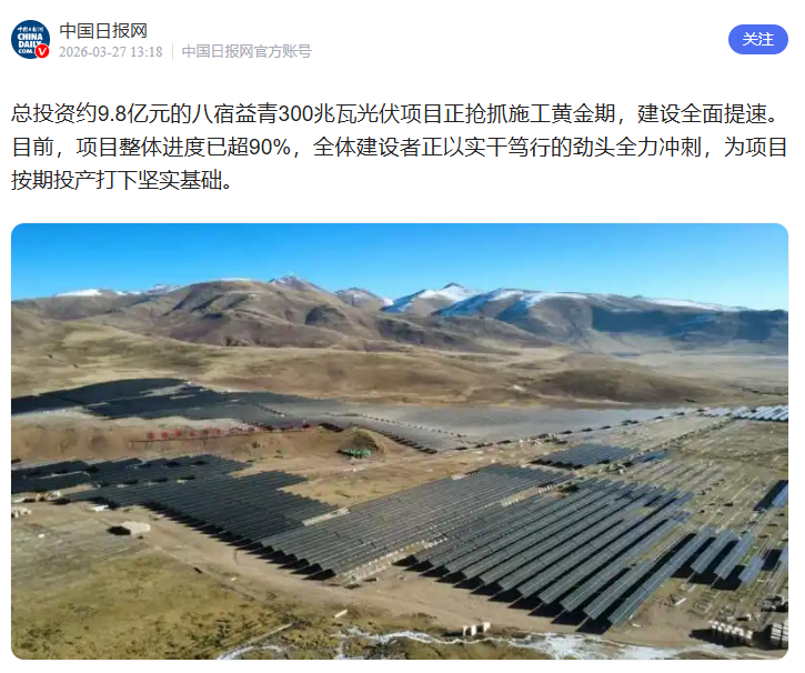 近日,中國日報、中國經濟網、中國西藏網等主流媒體相繼報道由公司勘測設計的西藏八宿益青300兆瓦光伏項目加快推進情況。項目建設進度已突破90%,正全力沖刺并網投產。該項目作為藏東南清潔能源基地示范工程,設計團隊以科技之力破解高寒高海拔難題,為雪域大地注入澎湃綠色動能。 項目位于西藏昌都八宿縣益青鄉,海拔4317至4458米,建設規模為交流側300兆瓦,占地面積約5364畝。項目配套新建220千伏升壓站,接入220千伏邦達變電站。 面對超高海拔嚴酷環境,西北院項目團隊充分發揮在超高海拔新能源領域的技術優勢,提前踏勘、精準勘測,優化場址布局與系統設計,確保項目高效適配超高海拔高原氣候與地質條件。項目采用生態友好型設計,優化方陣布局、采用高橋架敷設電纜,最大限度減少地表開挖與生態擾動。設備選型采用大功率雙面雙玻組件、構網型大容量逆變器等,同時設計優化組件傾角、方位角,最大化利用高原太陽輻射,實現高發電量設計。 建設工程中,設計方案深度融合智能化理念,助力項目在建設中全區率先采用智能光伏機器人,并配套遠程集中控制、無人機智能巡檢等先進技術,大幅提升施工效率與質量,完美詮釋“電建智慧”與“高原速度”。 建成后,該項目年發電量可達5.3億千瓦時,相當于節約標準煤約16萬噸,每年減少二氧化碳排放約43.6萬噸,可滿足約138萬人的全年生活用電需求。 鏈接:https://mbdlite.baidu.com/newspage/data/landingsuper?_refluxos=a2&isBdboxFrom=1&sid_for_share=&context=%7B%22nid%22%3A%22news_9334553969565364517%22,%22sourceFrom%22%3A%22other%22%7D&rs=2887053724&ruk=A8U9yEQCBy4uhz1Hmb-hxA&urlext=%7B%22cuid%22%3A%22_8Hr8_u5Sagf8vi2liBQugugvij3aHfSjuH8ig8fviK50qqSB%22%7D&pageType=1&_scene_id=&mcpParams=%7B%7D |