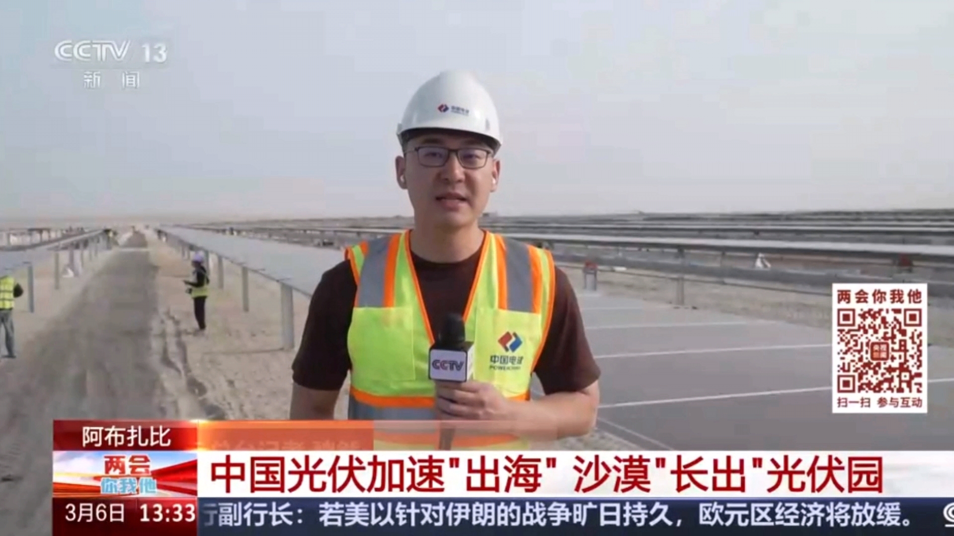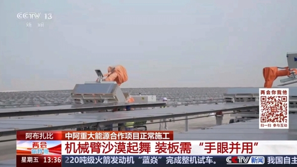 3月6日,中央廣播電視總臺全國兩會期間特別節(jié)目《兩會你我他》報道公司所屬華東院總承包的阿聯(lián)酋阿布扎比PV3阿吉班光伏項目。項目位于阿布扎比東北部,場區(qū)占地面積約20平方千米,項目直流側(cè)總裝機容量約1.8GW。該工程是阿聯(lián)酋政府落實“阿聯(lián)酋2050能源戰(zhàn)略”的重要項目之一,項目建設(shè)過程中將提供3000余個工作崗位,為當(dāng)?shù)鼐用窬蜆I(yè)提供支持。建成后,每年將為16萬戶家庭提供清潔能源,減少240萬噸二氧化碳排放。 報道鏈接:https://tv.cctv.com/2026/03/06/VIDEaE54OeOF7mZDwxEYLlY2260306.shtml 《兩會你我他》報道華東院總承包的阿聯(lián)酋阿布扎比PV3阿吉班光伏項目 機械臂開展作業(yè) |