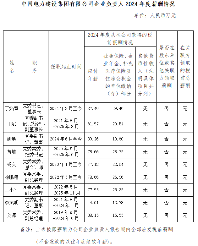 中國電力建設集團有限公司企業負責人2024年度薪酬情況